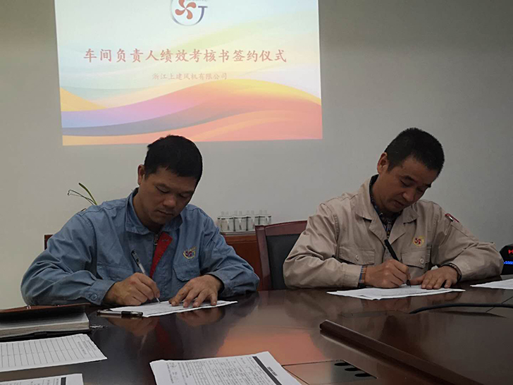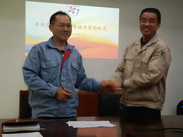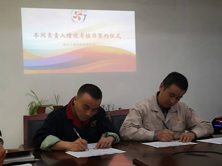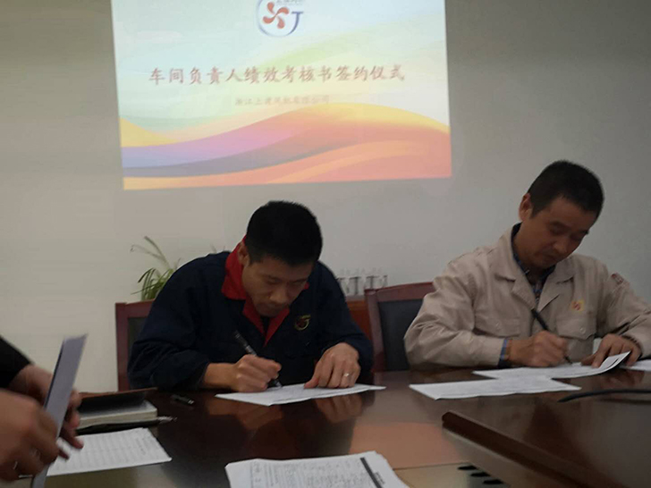 签订仪式后童总提出了3点要求:一、绩效考核要杜绝感情因素、做到公平公正、更不能流于形式;二、各车间主任要时刻保持学习的心态,学习先进的加工设备与工艺,学习提高产能、6S现场的先进管理方式,培养一大批一专多能的复合式制造人才;三、深耕风机产业,坚持不懈地服务营销、坚守制造优质风机装备的那份初心。