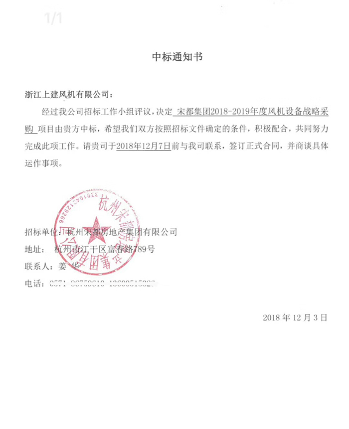 继成功入围中国百强房企业——华鸿地产集团战略供应商后,今天公司又迎一大喜讯,在宋都集团组织的战略集采招标活动中yl23411永利官网登录杀出重围,成功成为宋都集团2018~2019年度风机战略供应商,为我司在品牌战略拼图上增添了浓重的一笔,也为yl23411永利官网登录后期的可持续发展推波助澜。