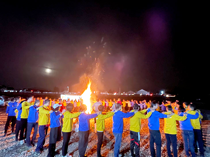 晚饭后,最让人激动人心的篝火晚会随着“皇后大道东、兔子舞”等活泼愉快的旋律拉开帷幕,浓烈而又跳跃的篝火在曹娥江边上猛烈的燃烧着,随风而舞的火苗窜上了秋高气爽的天空,旺啊!烧啊!队员们个个向火堆投木柴,众人拾柴火焰高。大家手拉着手,手搭着肩,围成一圏尽情欢快的跳着兔子舞,此时没有老板、没有领导,大家是和谐共处的一家人,喜悦和兴奋之情溢于言表。篝火活动后还举行了两个全体员工共同参与的小游戏节目,PK成绩,分享着快乐,参与人人得获。最后,大家露营在以大地为床,天空为被的曹娥江边上,吹着晚风,听着音乐,有的持续喝着小酒,三五成队的畅谈工作生活,有的占进帐篷打起小牌,温馨的场面让人留连!