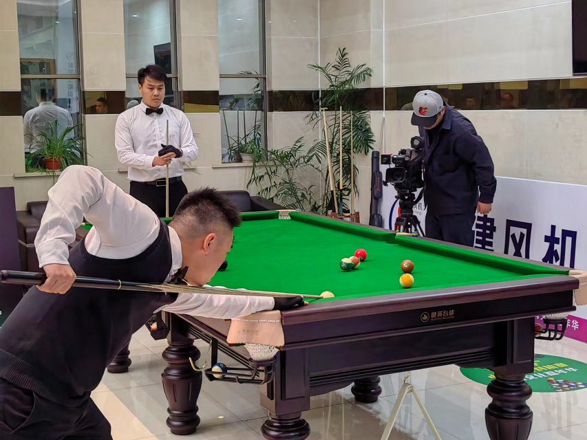 本次杯赛火热的状况吸引不少公司外的台球爱好者关注,连电视台都闻讯赶来采访,正巧赶上本次比赛最精彩的一场。公司市场部的黄凯与徐梁波,为大家带来一场让人直呼过瘾的激情对抗,只见两位选手身穿白色衬衫,脖戴黑色蝴蝶结,动作优雅。每一次出杆都牵动在场所有人的心,当黄凯还剩一颗黑球时,徐梁波灵机一动,用一杆高杆吸库斯诺克征服全场观众,大家都纷纷鼓起掌来。