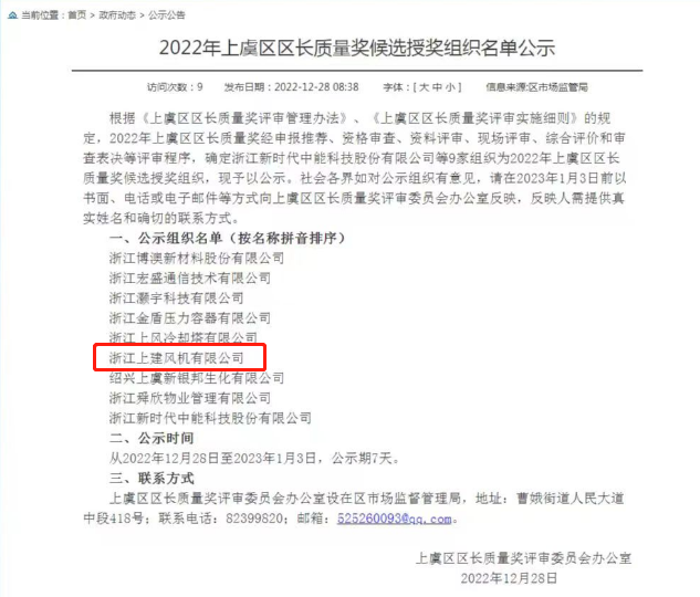 2022年12月,2022年上虞区区长质量奖候选授奖企业名单公示结果显示,yl23411永利官网登录风机荣登榜单,获得2022年上虞区区长质量奖候选授奖。